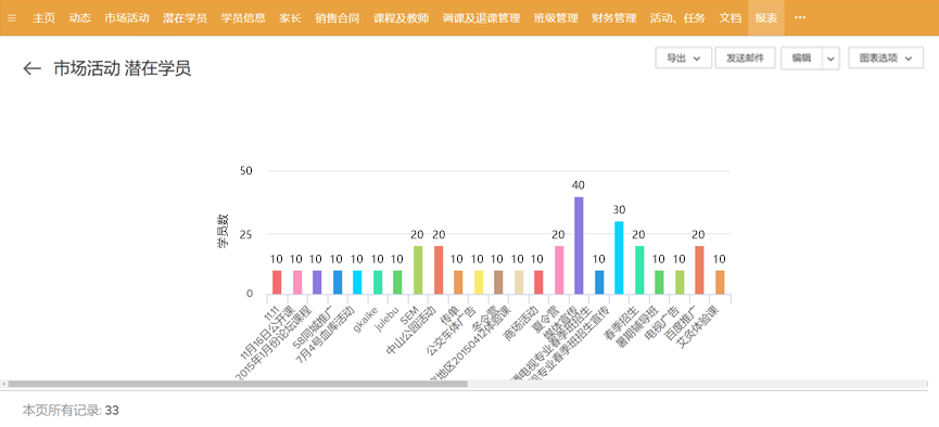 精准管理招生会、辅导班、楼宇广告等线上线下各类营销活动 营销成本预算vs实际成本统计,监测投放效果 市场活动效果分析报告 -