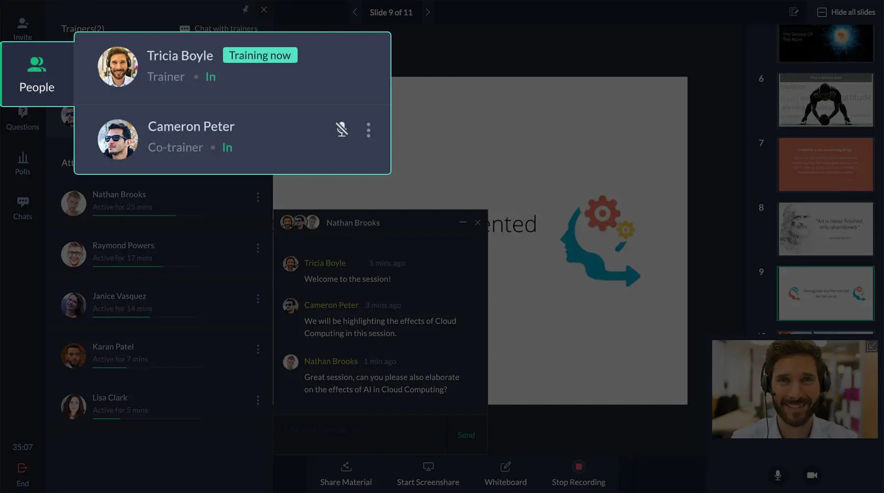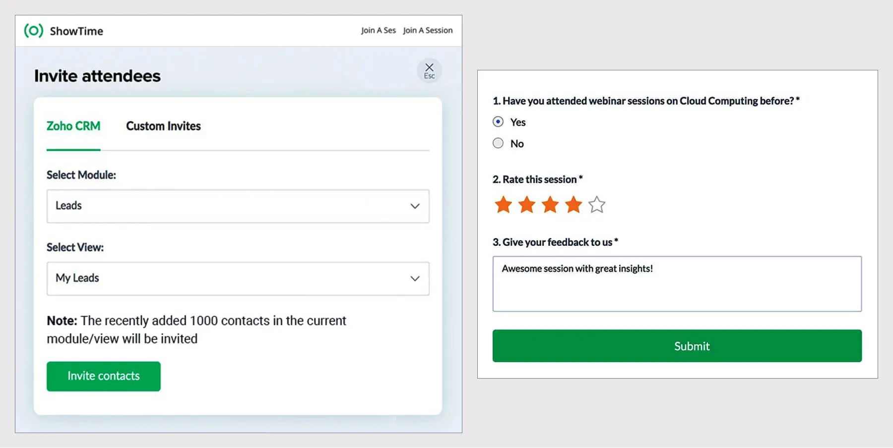 您可以通过在线会议的方式为合作伙伴培训产品知识,集成 Zoho Showtime 既简单又高效。通过调研的方式在会议期间与合作伙伴互动,收集意见反馈,实时解决疑虑。还可以跟合作伙伴共享重要文档,比如图形、图表和表格,帮助他们了解您的产品在不同时期或特定市场中的表现。