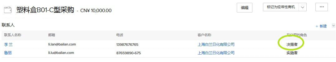 跟客户公司中不同角色的人沟通,沟通内容和方式是不同的。比如技术总监一般会比财务总监有更多的问题和需求。在CRM中更新客户对接人的角色,方便销售和客服知道对什么人说什么话。