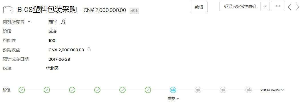 可在交易页面直接查看和更改交易阶段。例如,与潜在客户通话时,如果随着谈话的进行,交易已从需求分析发展到请求报价,那么销售员可以直接在当前页面更改交易阶段。