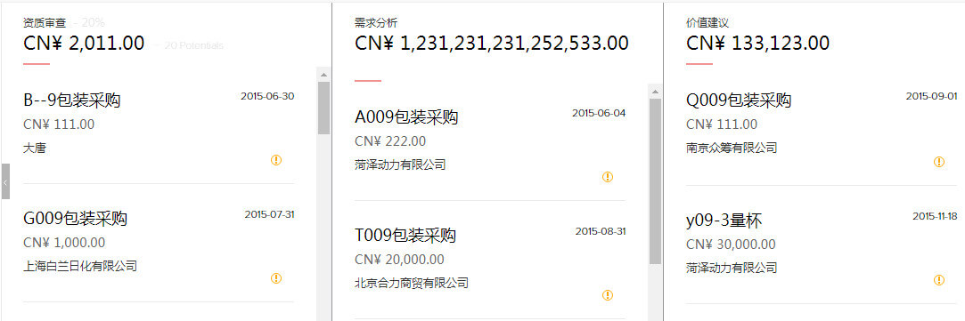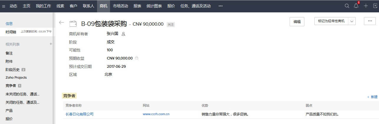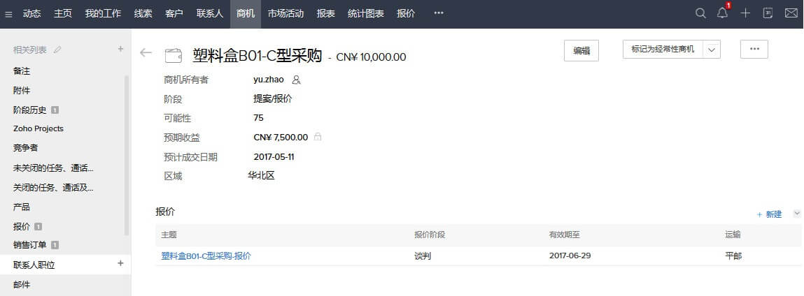 Zoho CRM中,可在一个页面集中展现所有交易的所处阶段、金额等,方便了解哪些交易需要立即采取行动,预期销售额完成度等。