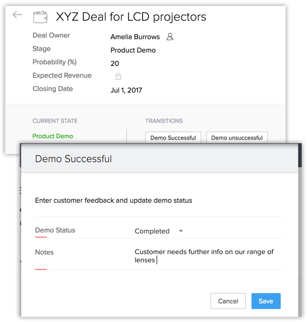 - 点击演示成功。将打开一个弹出窗口,提示您输入演示的详细信息,例如,演示状态和有关客户的演示反馈备注。将状态更新为“已完成”时,可审查商机的资格。