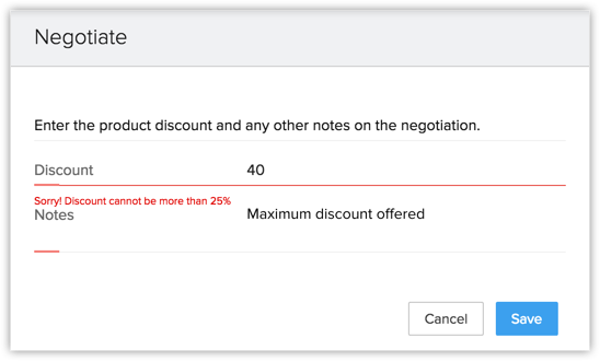 所有者:记录所有者 条件:无 | 添加消息:输入产品折扣并添加有关协商的任何其他注释。 添加字段:折扣。 添加验证条件:折扣 <= 25 错误消息:抱歉!折扣不能超过 25% | 无 |