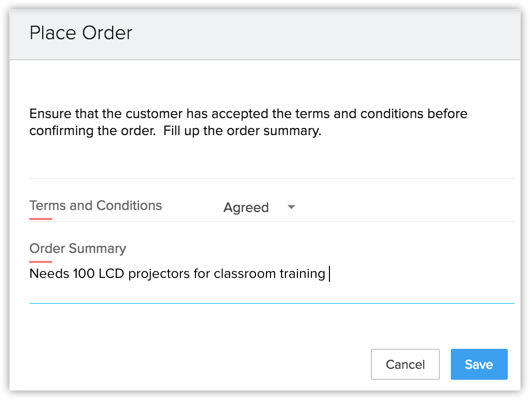 所有者:记录所有者 条件:无 | 添加消息:确认订单前,确保客户已接受条件和条件。填写订单摘要。 添加必填字段:条款和条件以及订单摘要 确认条款和条件已被接受。 | 将“电子邮件警报”关联至订单管理团队和销售经理。 “已针对交易提交订单”。 |