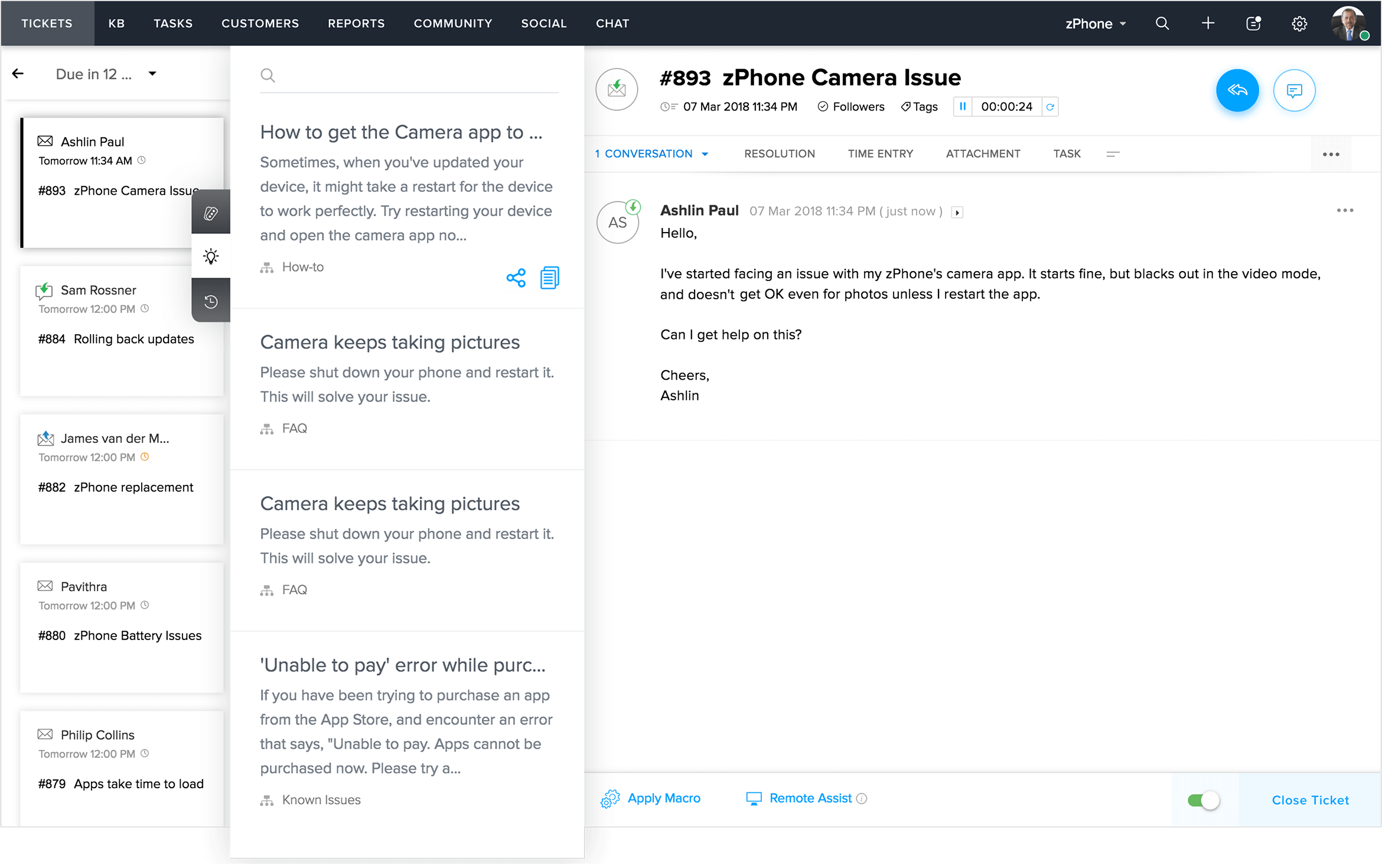 无论有多少快捷方式,如果没有客户背景信息,客服仍然难以解决客户的问题。Zoho Desk电子邮件服务工单软件可将之前客户与公司的所有互动集中在一处,帮助客服准确了解客户的需求,并提供解决方法。