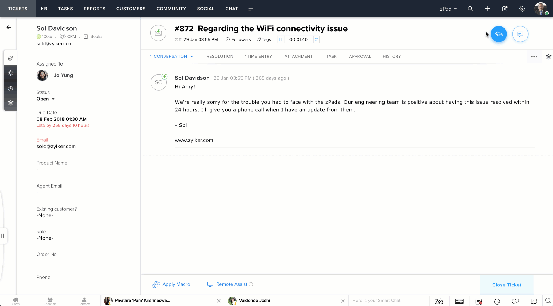 同时处理多个服务工单确实比较复杂。为了帮助客服人员正常处理工单,Zoho Desk 在过程的重要阶段向客服人员发送自动通知,例如分配服务工单时,收到回复时或添加任务时。无论并行处理多少服务工单,通过即时通知,客服人员都不会错过任何一个服务工单的进展。