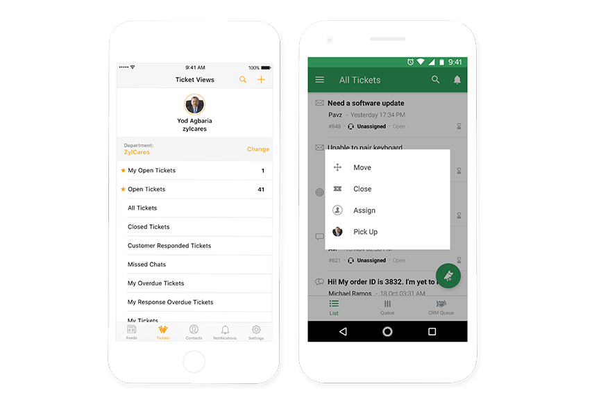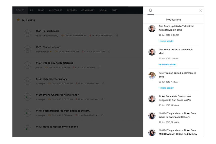 Zoho Desk 移动应用,让您无论身在何处,都能及时查看、处理客户工单,提升客户体验。如果您正在处理一个工单,却收到一条新工单,可以一键滑动关闭,也可以将新工单转给其他同事。