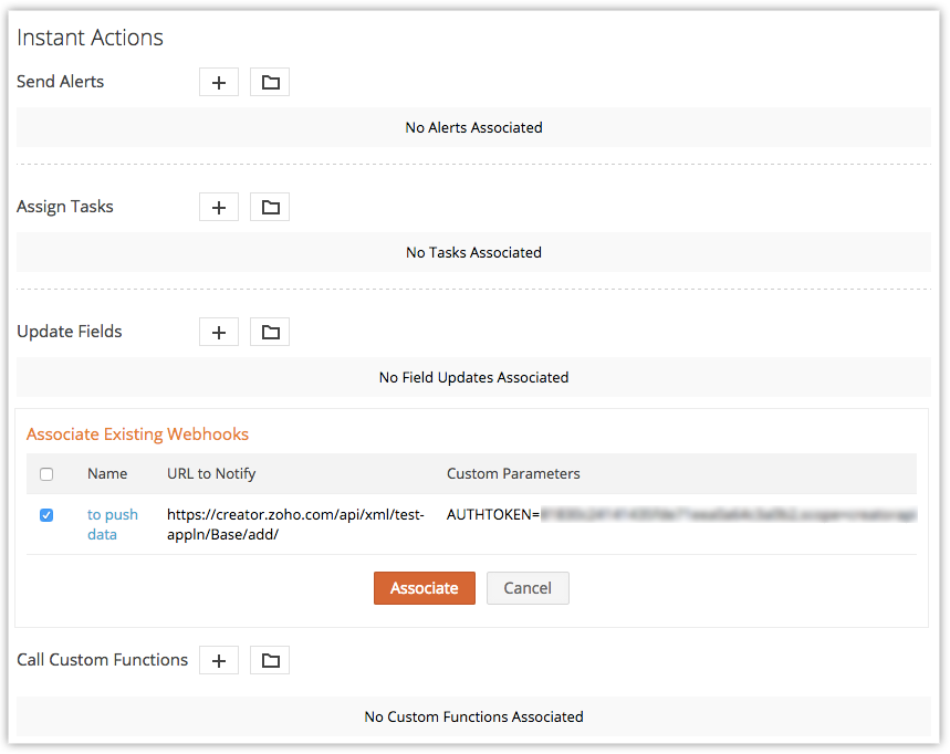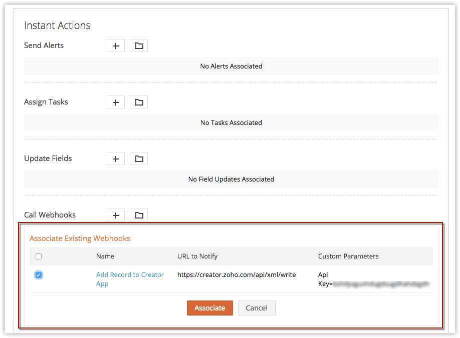- 您可为每个工作流规则关联最多 6 个(1 个即时操作和 5 个基于时间的操作)Webhook。