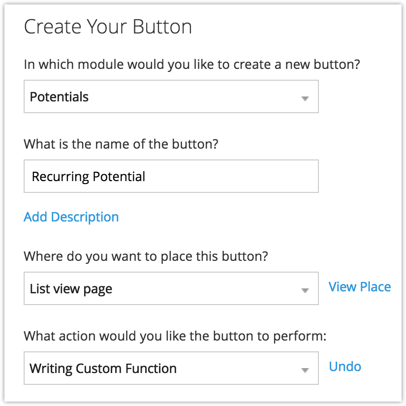 自定义按钮可用于 Zoho CRM 的所有标准模块和自定义模块,活动模块除外。