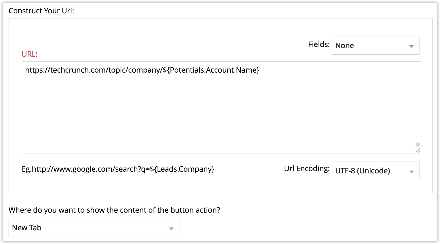 如果要打开静态 URL,请将“字段设置”保留为无。如果要根据 CRM 系统中的数据使用合并标记自动生成链接,请从字段下拉列表中选择字段。这将会在 URL 中插入字段变量。只有与您在创建按钮时选择的模块相关联的字段才会显示在菜单框中。 - 选择 URL 编码类型。