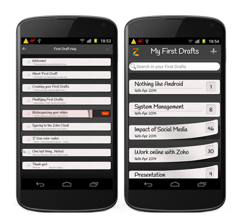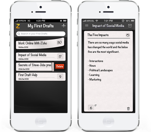 First Draft lets you quickly create simple, text only presentations using your iPhone or iPad. The idea for a great presentation may strike you on the go. Now you can just pull out your phone and immediately get the first draft done. This gets automatically synced with Zoho Show, our full-blown, online presentation application where you can jazz things up by adding images, graphics, animation etc.