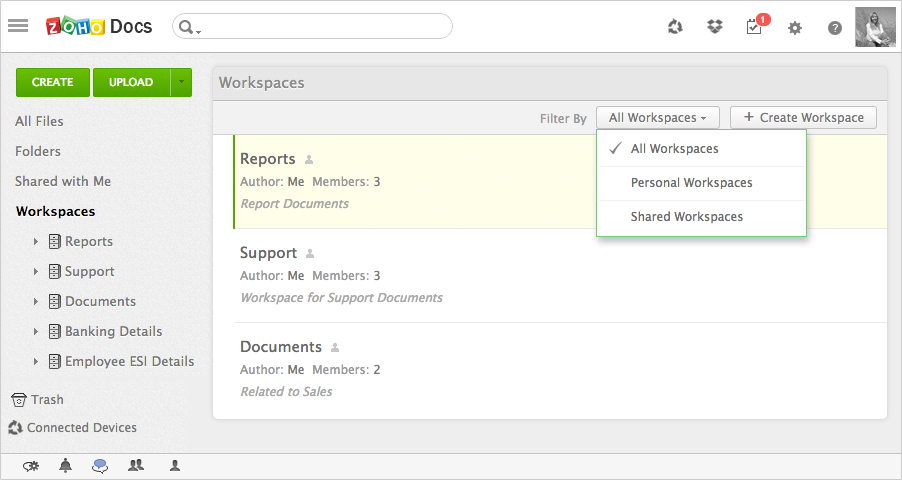 Zoho Docs workspace is a collaboration tool that allow you to share an entire folder or folders. You can create Workspaces for different projects and share the workspace with your friends, colleagues, etc,. It makes file sharing easy and provides a collaborative environment for documents so you can work on the same document in real-time and get instant feedback on document changes.