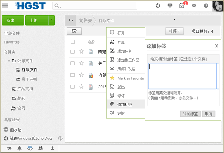 As you continue using document management system, vast number of documents, spreadsheets, images, videos, etc, gets stored in a central repository, so it is very essential that you are able to locate the required documents in a quick and efficient manner. To achieve this, Zoho Docs has a 'tagging' feature which allows you to assign tags to the documents which is useful while retrieving a specific document. Tag is a user-defined keyword or label attached to documents and Zoho Docs provides a simple way to create and attach tags to your documents.