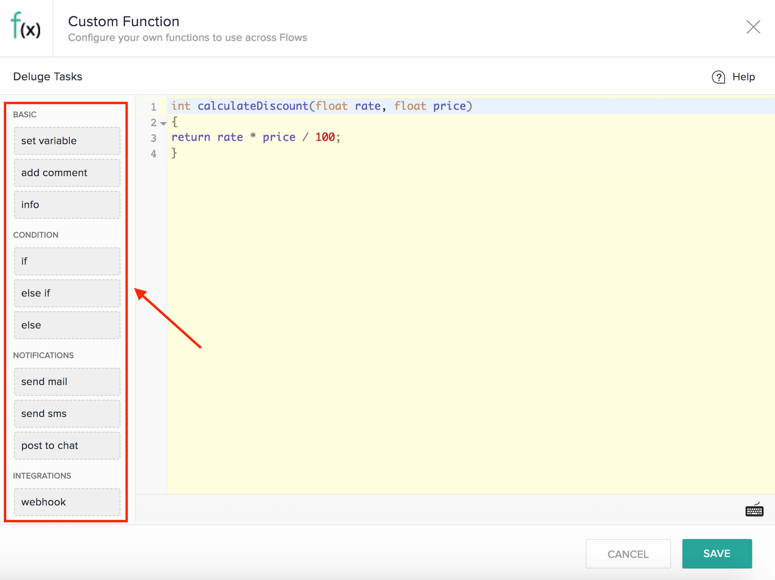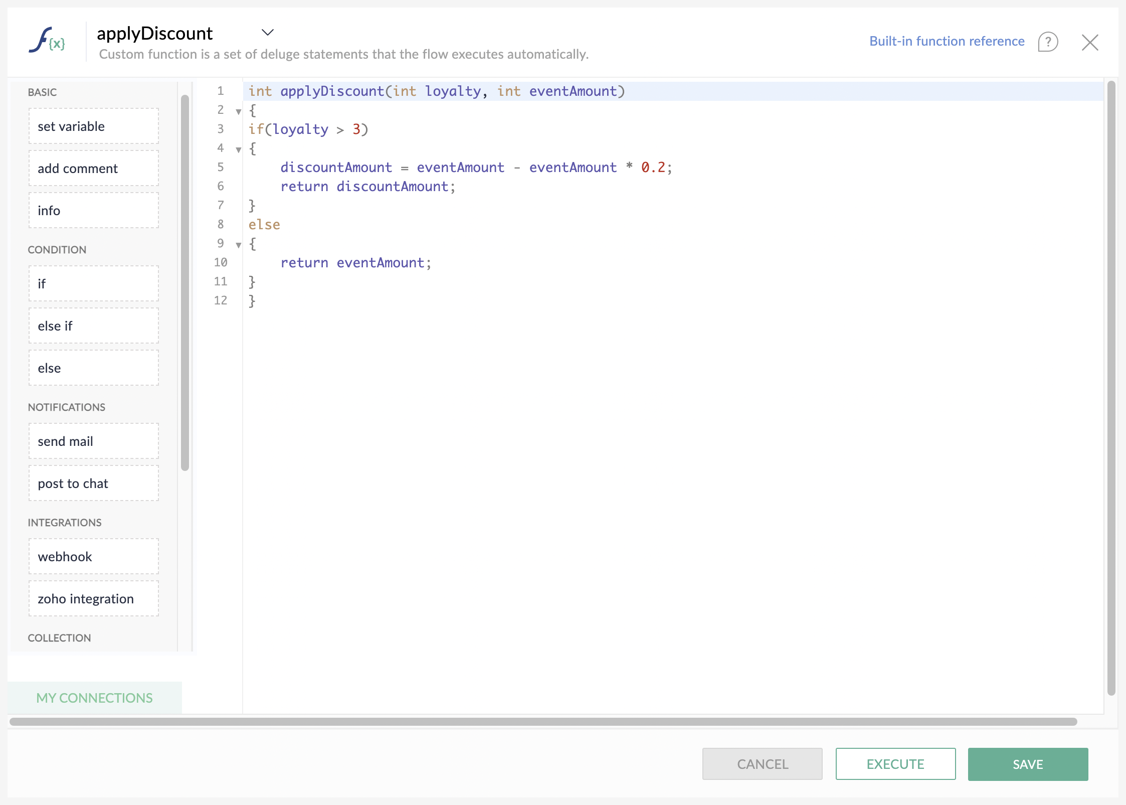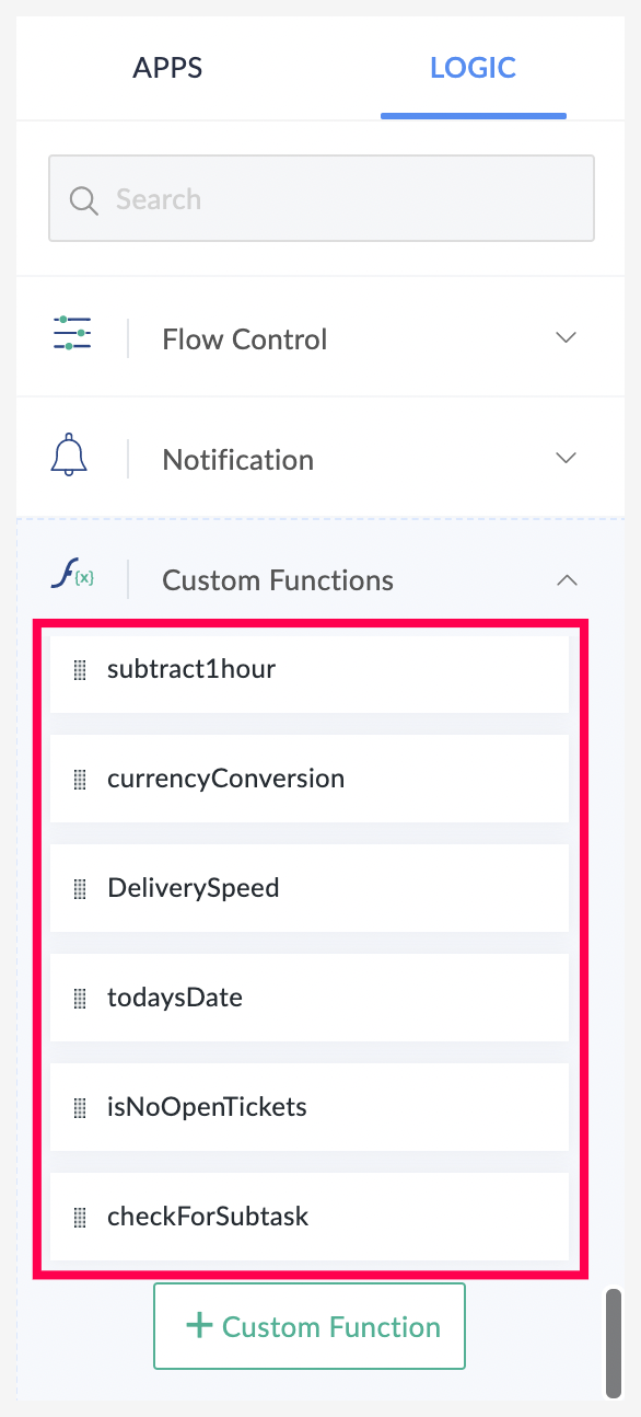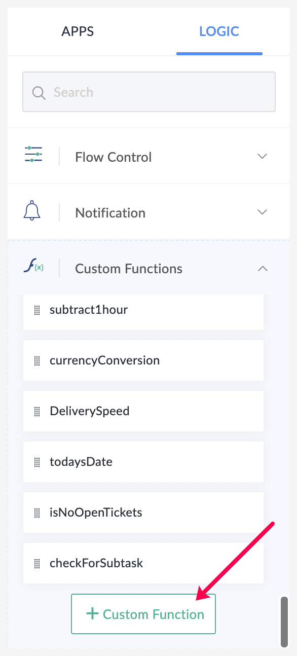 在 Zoho Flow 上,您可以编写自己的 Deluge 代码来创建自定义函数,以使您的工作流功能更强大。这些函数可灵活地实现简化重复性任务的复杂工作流。例如,您可以创建一个自定义函数来计算发票的折扣率,或创建一个函数来分析支持工单并在存在否定语句时提醒您。