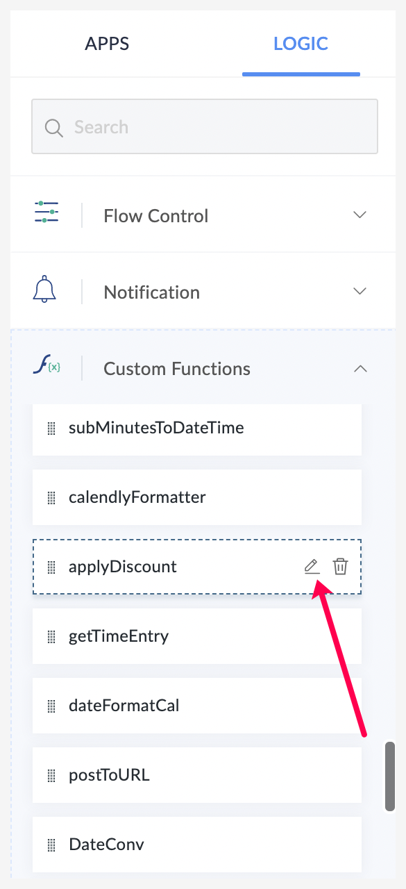 - 要修改自定义函数代码,请点击函数上的“编辑”图标。机构中的任何成员都可以编辑或删除该机构中的自定义函数。