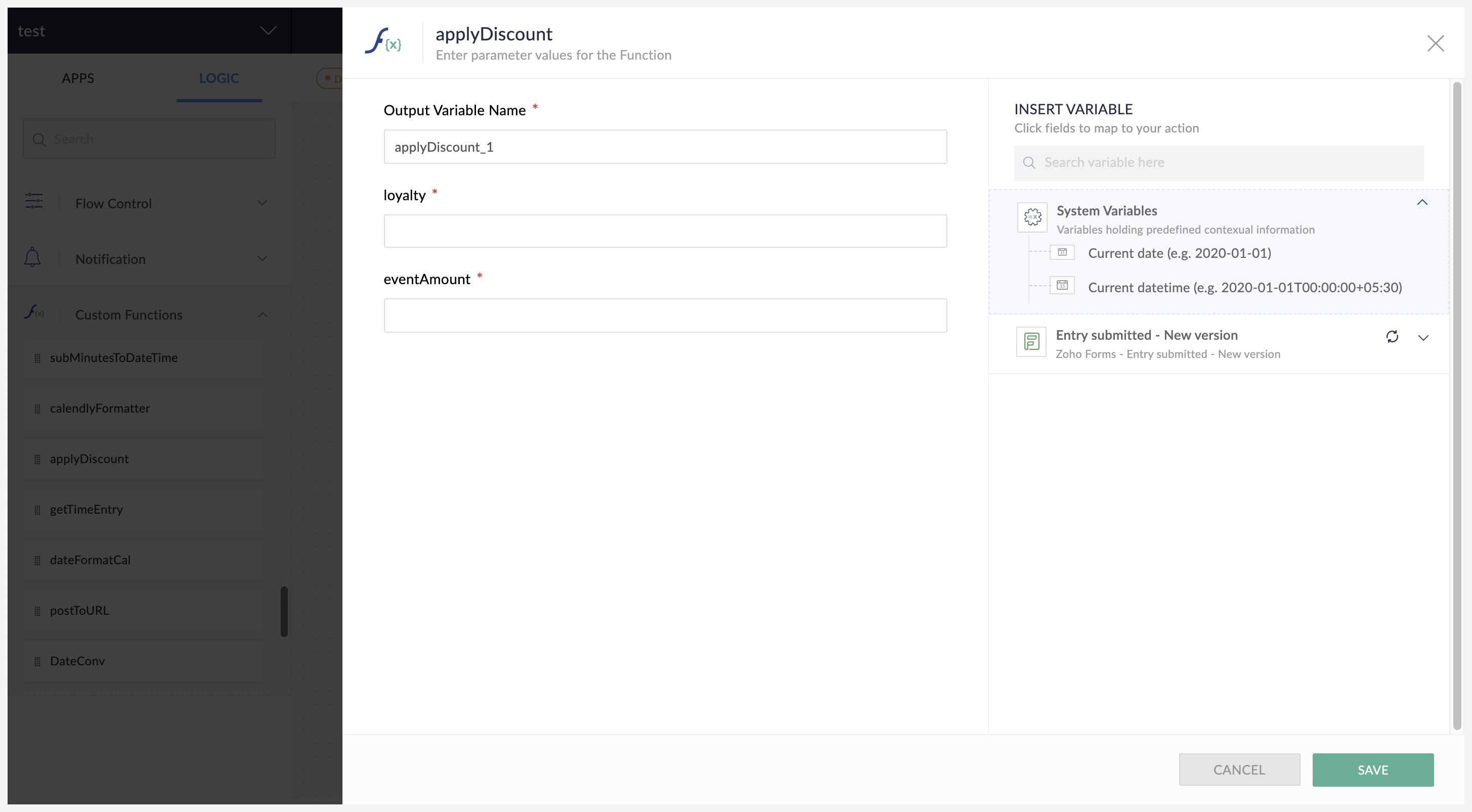 例如,如果要在 MailChimp 触发器与某个 Zoho Creator 操作之间创建此自定义函数,请将 myDate 映射至 MailChimp 中的日期字段。fromFormat 将是 MailChimp 的日期格式,而 toFormat 将是 Zoho Creator 的日期格式。