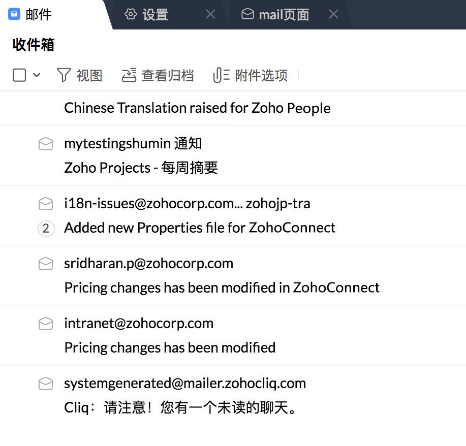 Zoho Mail 的高级搜索功能可让您快速找到所需的电子邮件,即使只记得几个词。可按主题、发件人、收件人、抄送人、邮件正文、附件名称、附件内容等选项进行全文搜索,也可点击"发件人"在新的页签下显示其发送的所有邮件。
