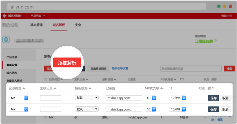 如果您域的DNS是经由万网管理了的,请参照以下步骤来为您的域添加MX记录,以进行邮件收发。
