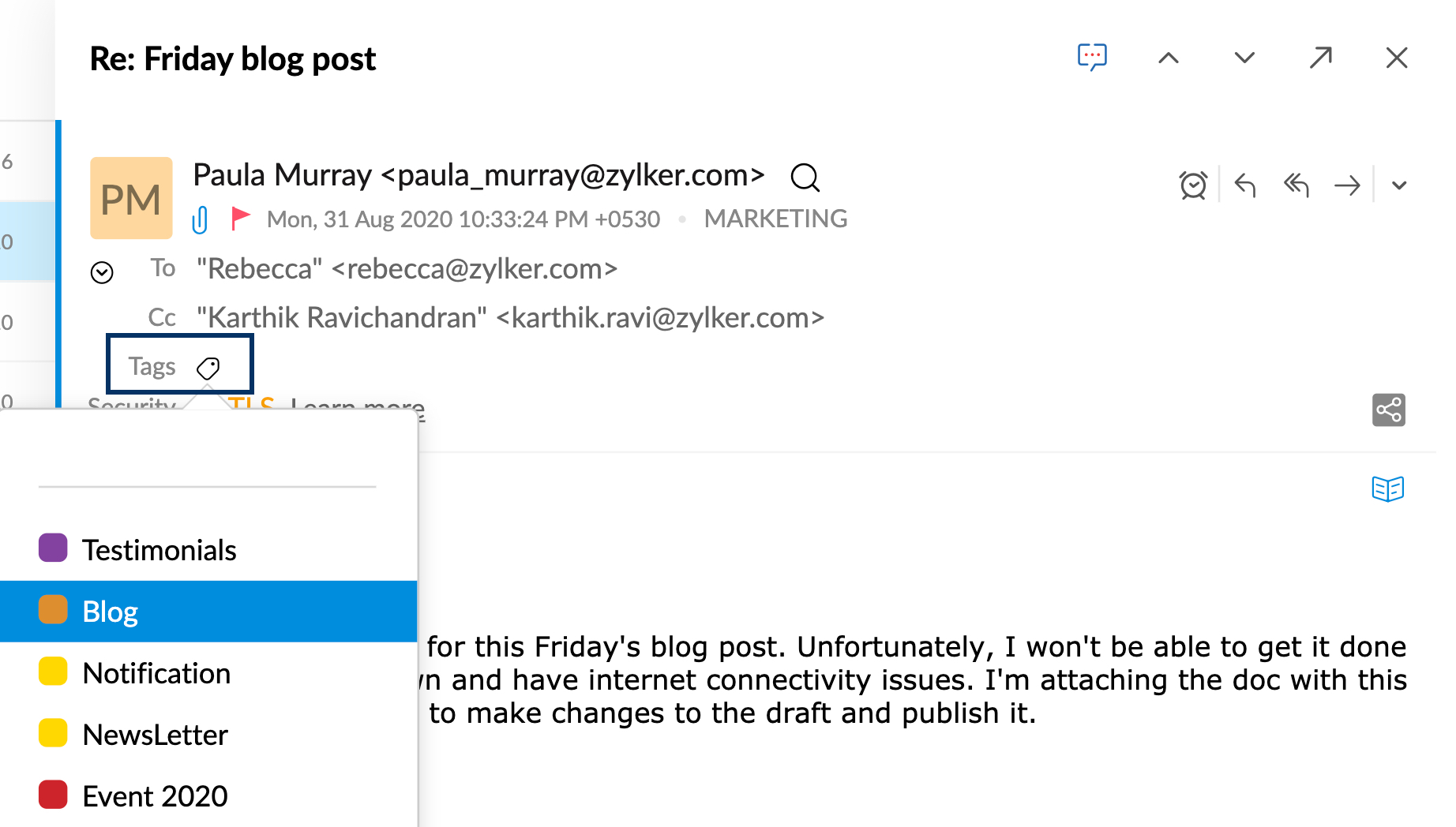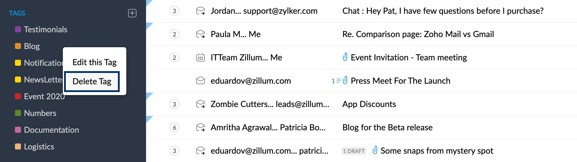 Zoho Mail 提供了标记电子邮件和为标签关联颜色的功能。颜色有助于轻松识别不同分类下的电子邮件。有些时候,您可能查看位于不同文件夹中使用某个相同标签的电子邮件,此时通过颜色来辨识也非常方便。