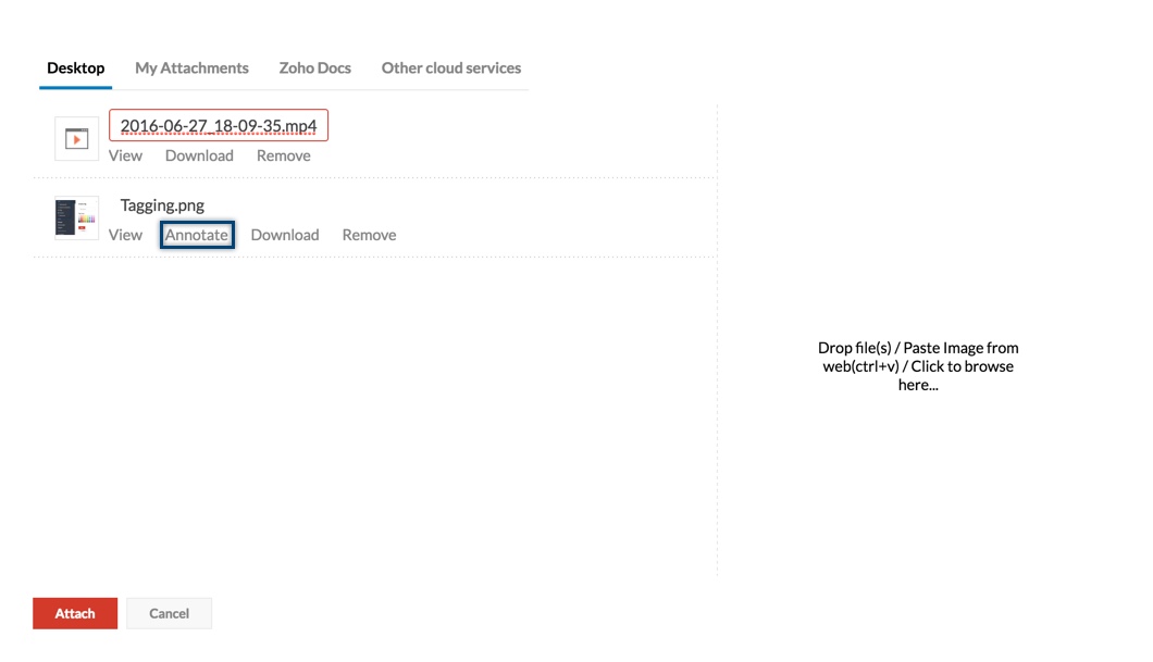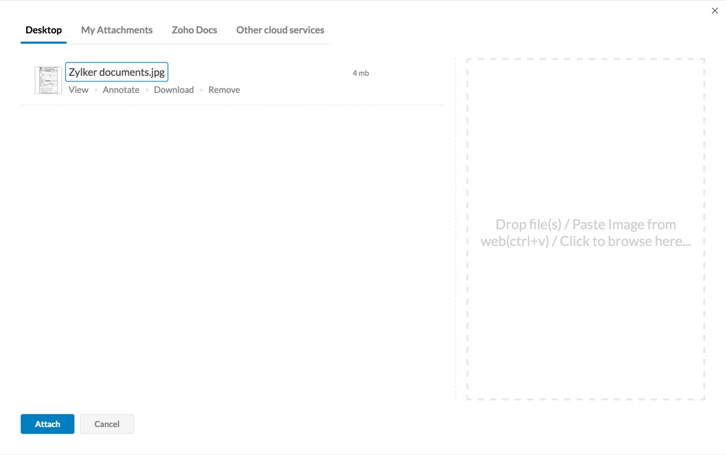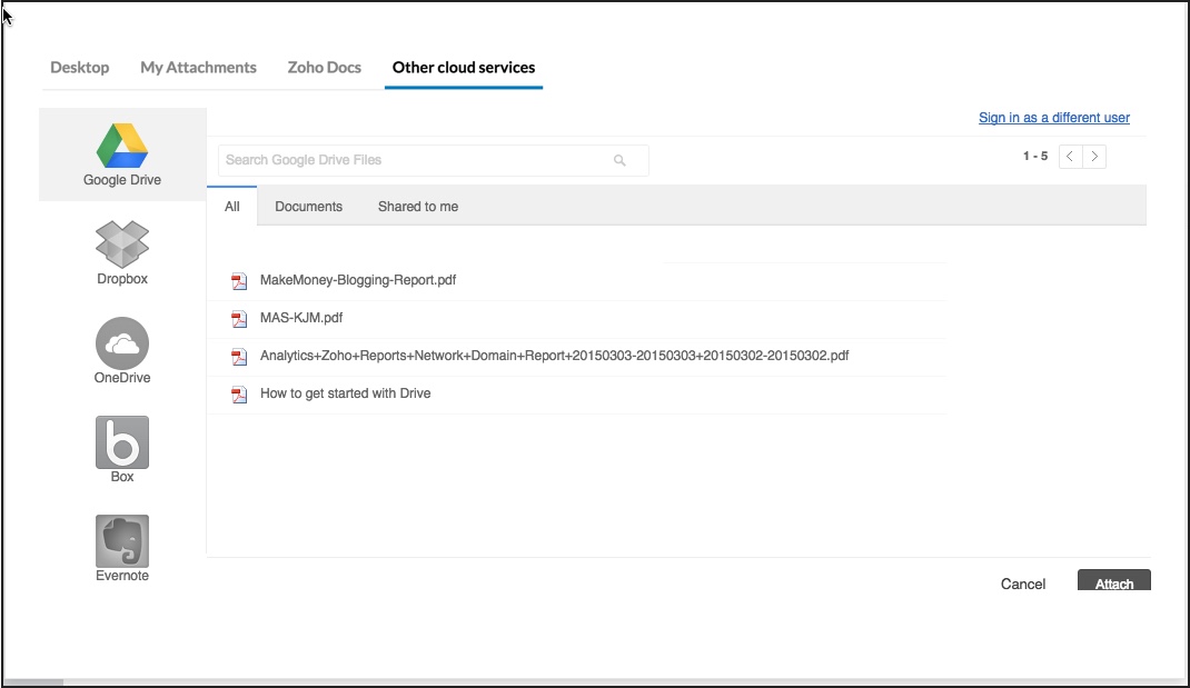 除了桌面文件和 Zoho Docs 中的文件外,您还可以从 DropBox、Google Drive、One Drive、Box 甚至 Evernote 中选择附件。