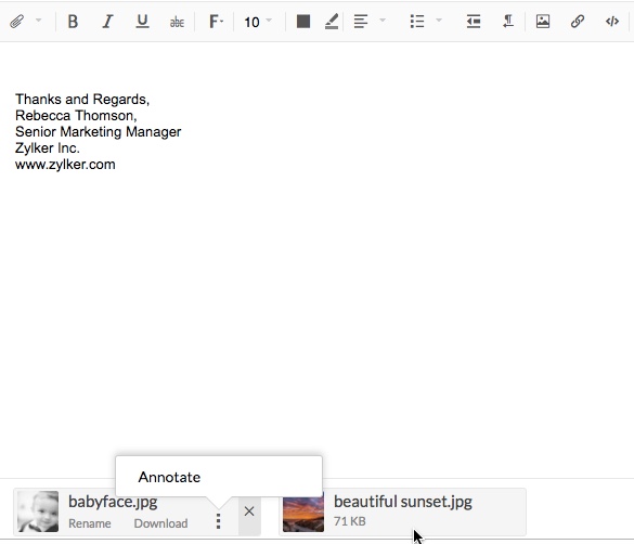 您附加的所有附件都列在正在撰写的电子邮件的底部。您可以重命名所附加的文件或给附加的图片添加注释,甚至在附加后也可执行此类操作。