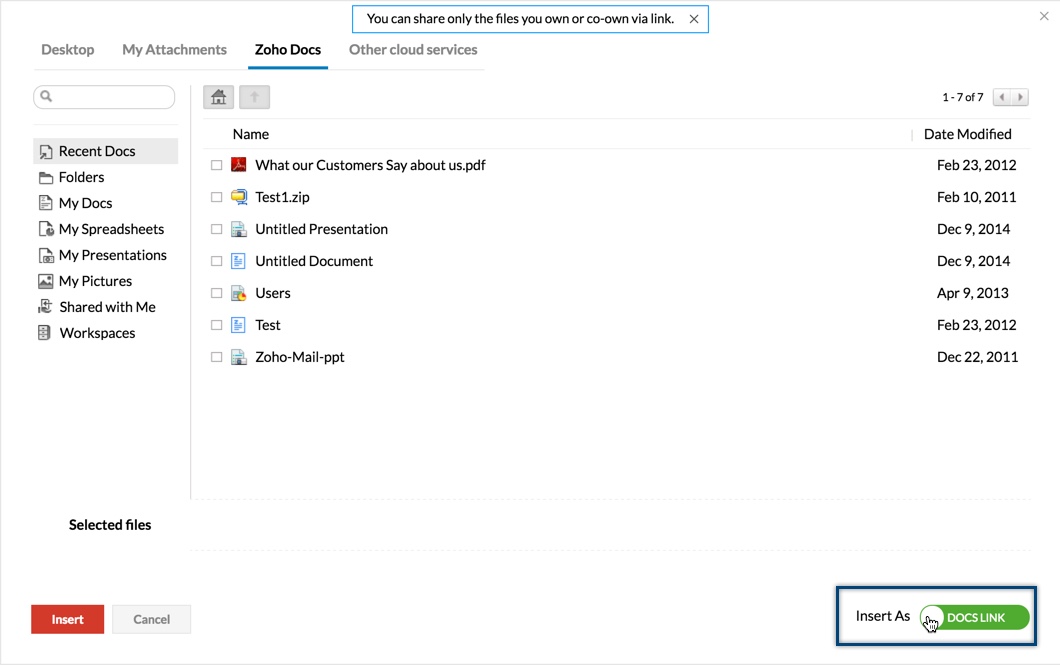 - 您还可以附加通过 Zoho Docs 共享给您的文件。
