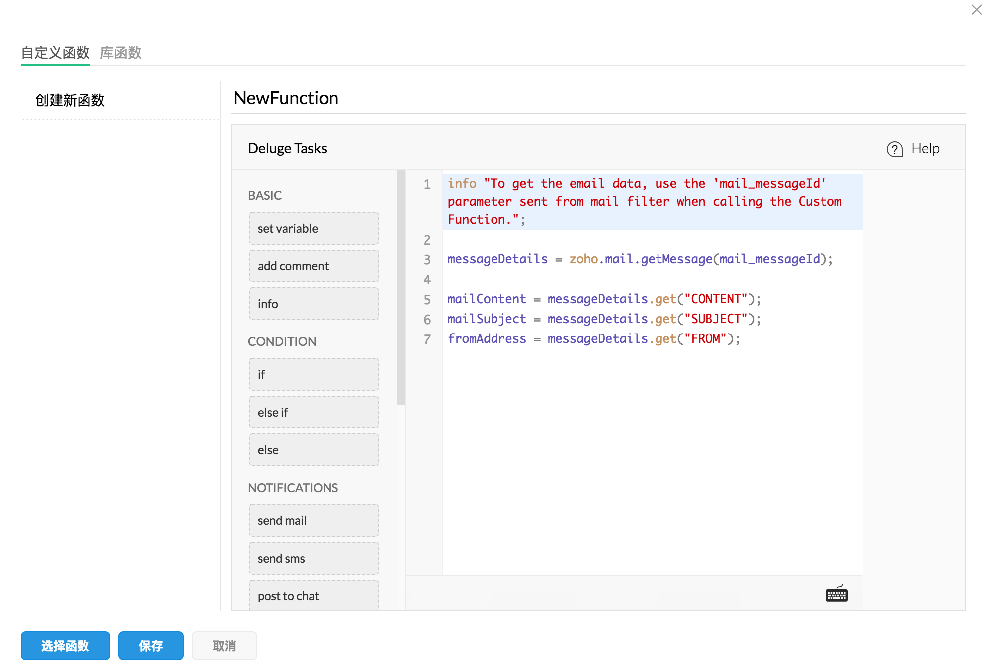 库函数是现成的可用脚本,可直接安装和使用。那里发布的有些库函数可能需要进行少量定制,以使它们适用于您的确切场景或用例。在您编写自己的自定义 Deluge 脚本时,也可以参考这些预先编写的函数,以检索与参数相关的邮件或与邮件相关的操作。