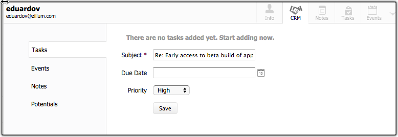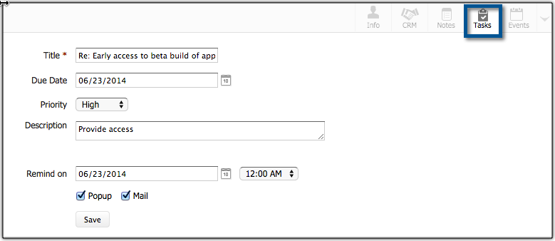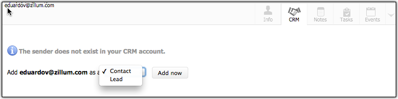 You can directly add a CRM contact or lead from the mail. Further once you have created the record in CRM, you can directly associate a task or event or note with the CRM Contact or the lead. Further if you have added a CRM Contact, you can link a potential with the CRM contact, from this section itself.