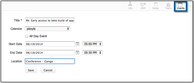 You can automatically create events from your email and add them to your Zoho Calendar application. In case you receive an email with a note for a meeting or a webinar or something for which you want to create and send an event invitation, you can do so from the Zoho Calendar gadget.