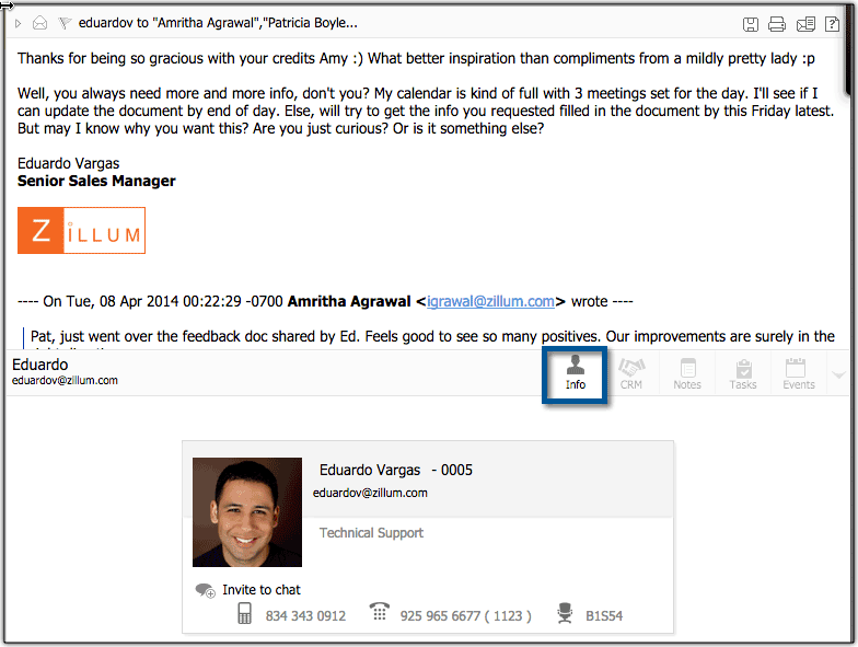 You can look up for a person in your organization, directly by clicking the Info icon. The Info tab provides the details like the desk location, extension number, online status of the Senders and the Recipients list in the selected email. The details in the Info tab are based on the data in Zoho People application and this integration will be available only if your Organization has subscribed to Zoho People.