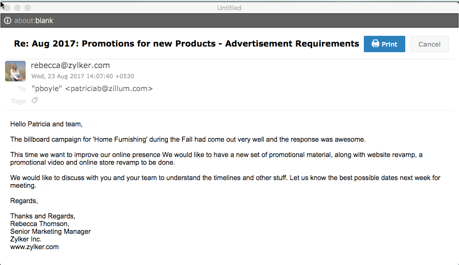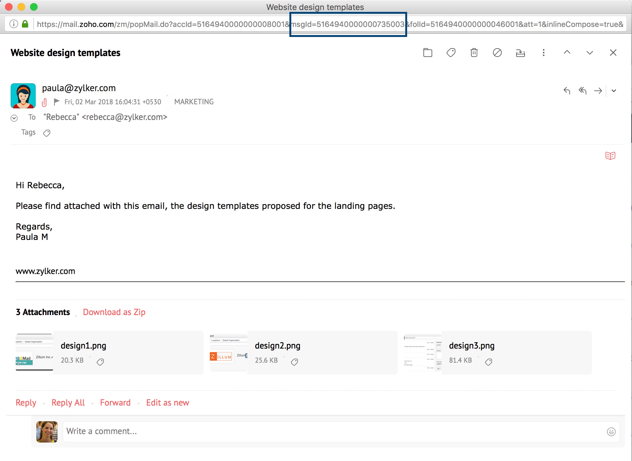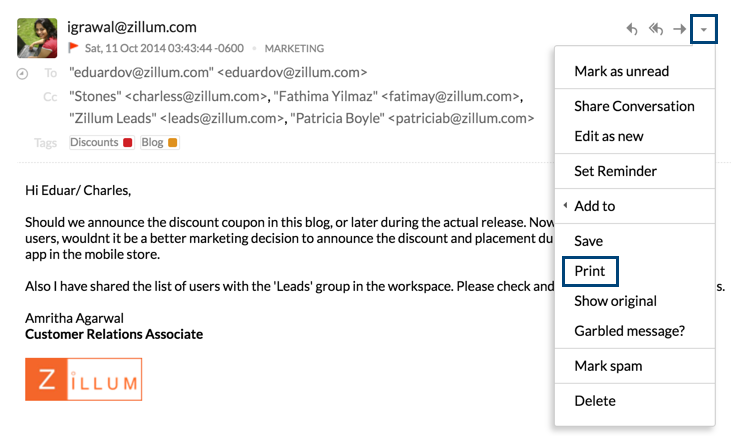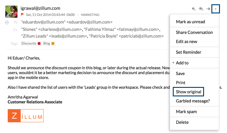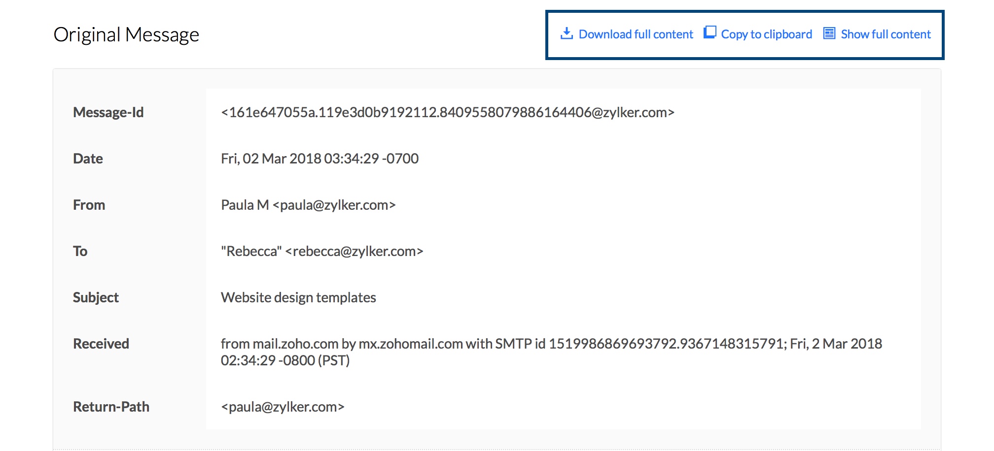 Zoho Mail 提供了多个可能对问题排查或解决其他问题(如电子邮件呈现方式不正确)十分必要的选项。这些选项包括获取电子邮件标题的介绍、乱码邮件的解决办法、保存电子邮件和打印电子邮件。