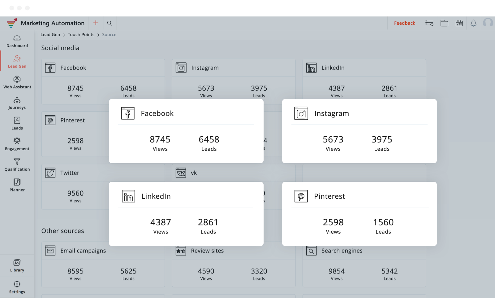 从电子邮件营销活动到网站,对线索进行跟踪,了解他们如何在网页上互动,根据他们的兴趣进行分组。通过触点,可以查看网站中哪些 URL 获得更多访问,哪些渠道获得线索最多等。