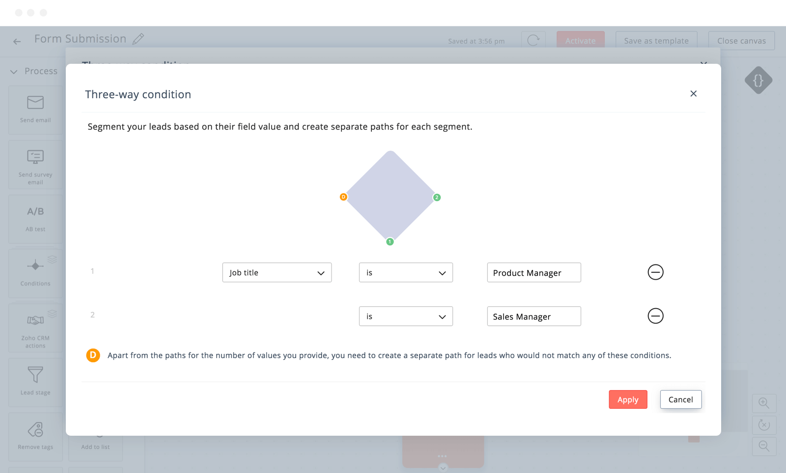 在旅程中添加条件和拆分逻辑,使决策更容易。这不仅为您大大减少了动手工作,还有助于为线索提供更个性化的旅程。