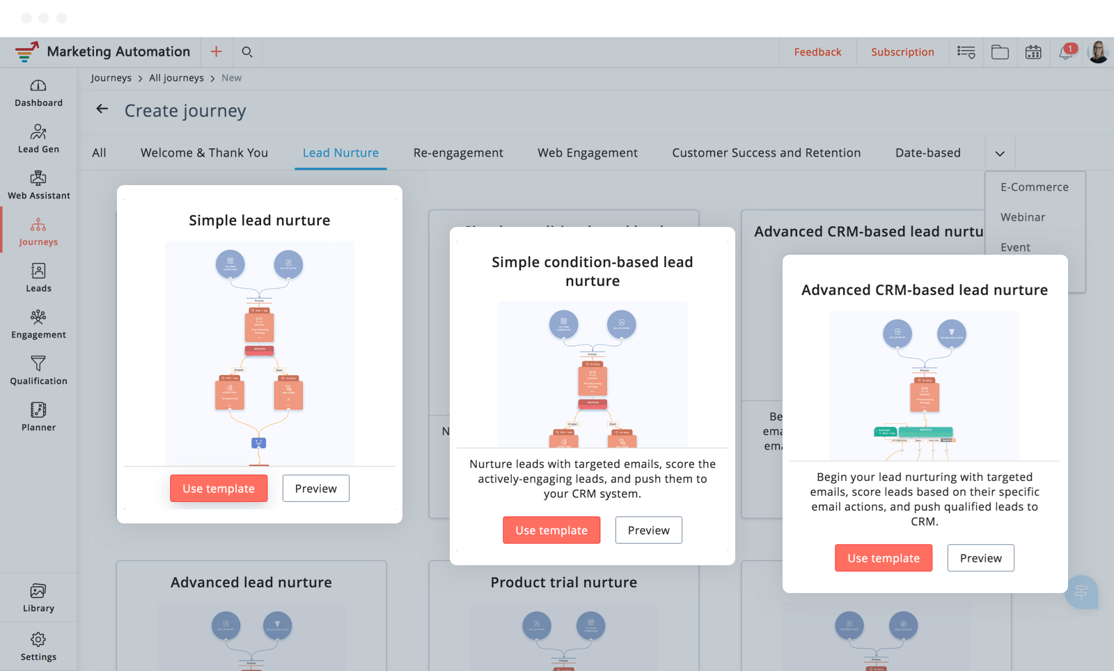 Zoho Marketing Automation历程模板库中有很多旅程模板,任由您来选择。这些旅程都是提前设计好的,可以帮您节省大量的设计时间,帮您专注于创建个性化消息。