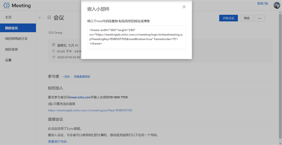 在您的网站嵌入、开展网络会议