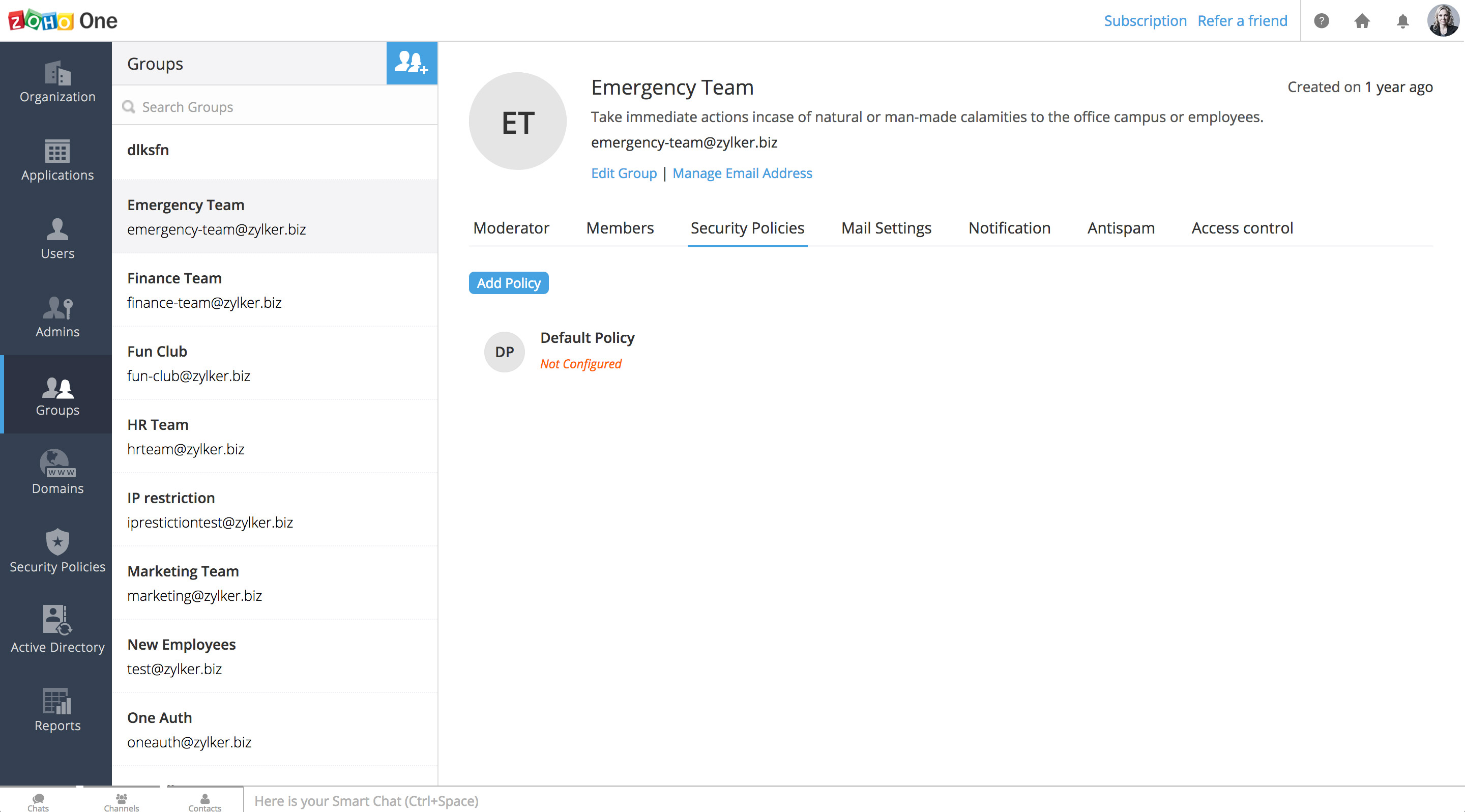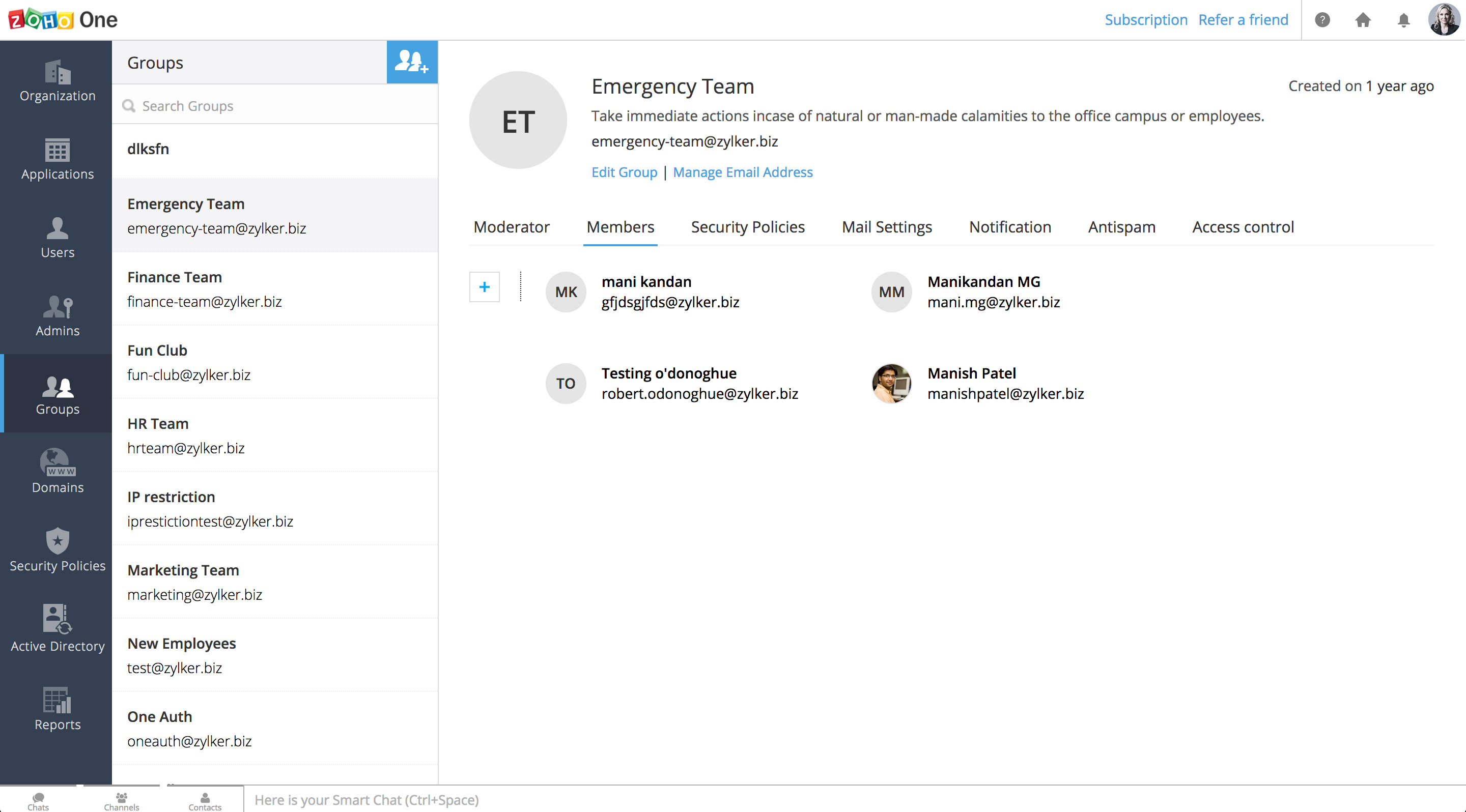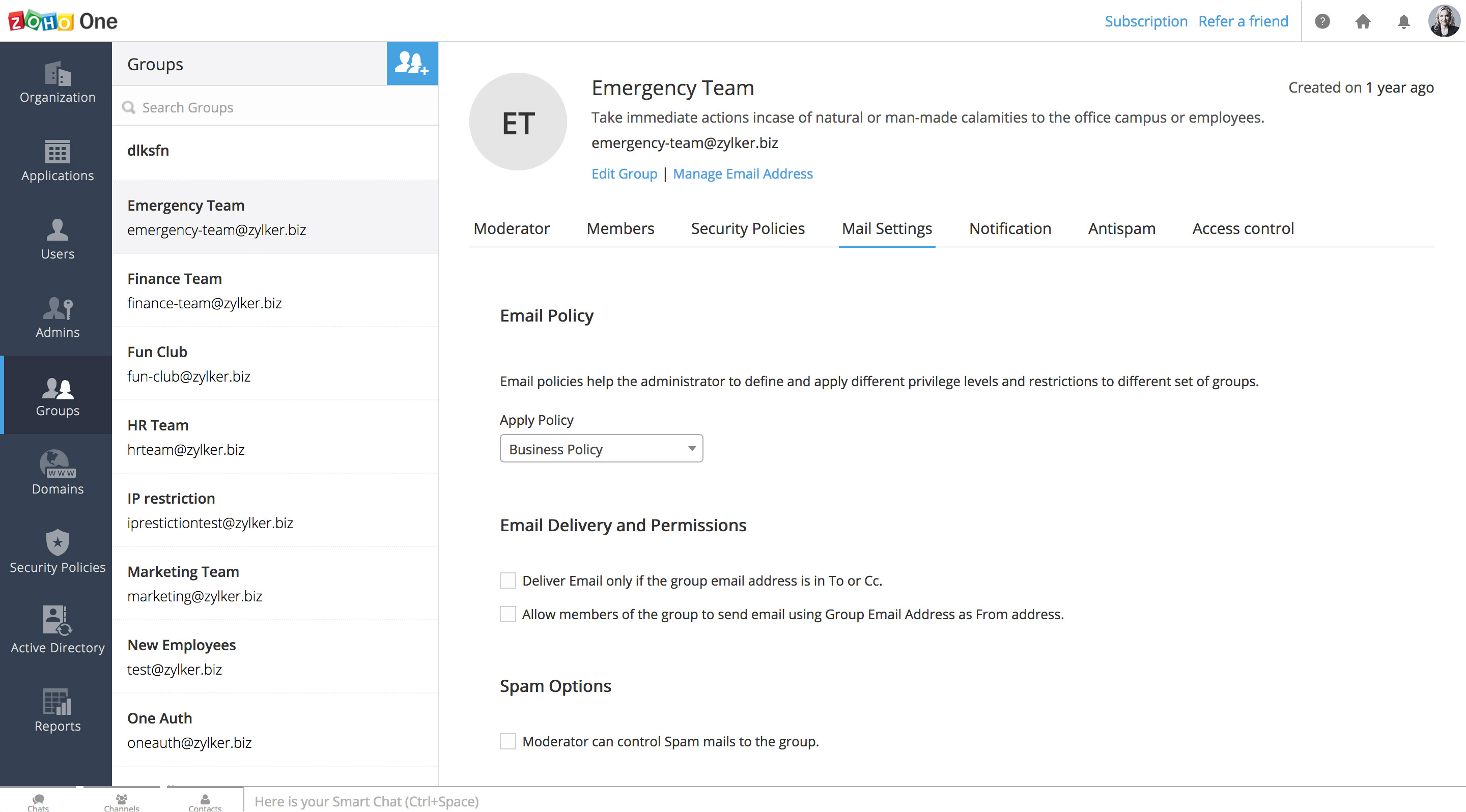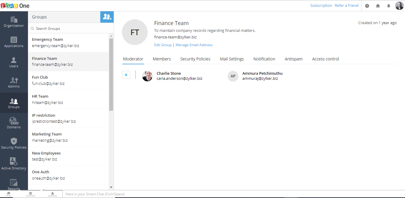 在Zoho One内,您可以为机构中的每个团队创建和管理群组。通过这种方式,您可以为该群组创建一个自定义的邮箱地址,并快速给该群组中的每个人发送电子邮件。