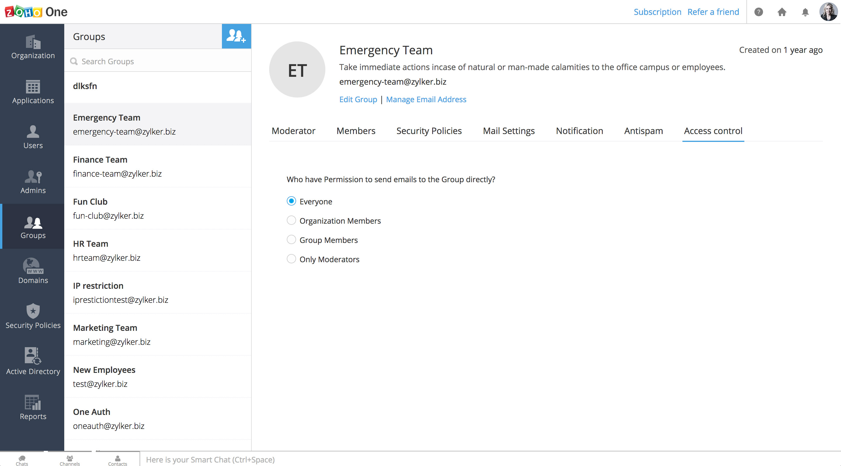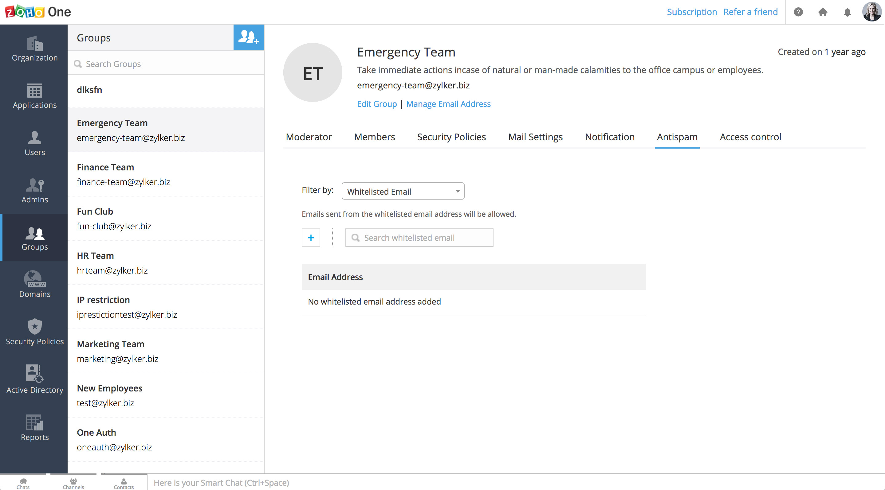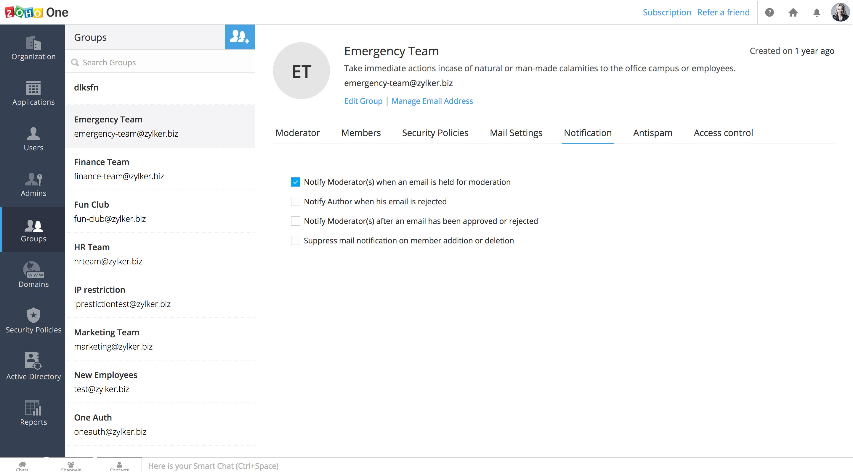 在Zoho One内,您可以为机构中的每个团队创建和管理群组。通过这种方式,您可以为该群组创建一个自定义的邮箱地址,并快速给该群组中的每个人发送电子邮件。