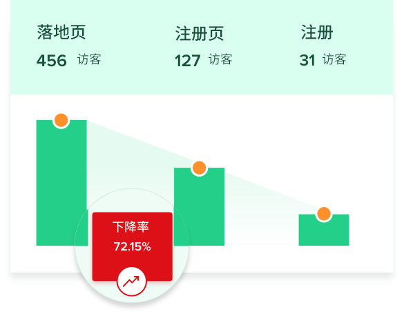 选择跟踪目标,监控链接按钮以及其他设计元素的点击情况。通过转化漏斗,查看哪些页面导致访问量大幅下降,及时发现问题。