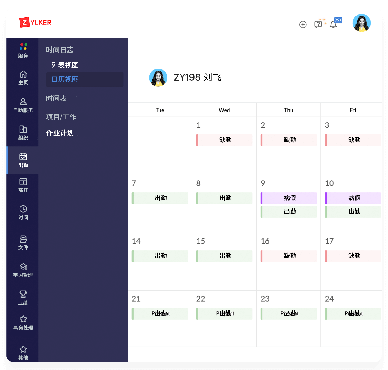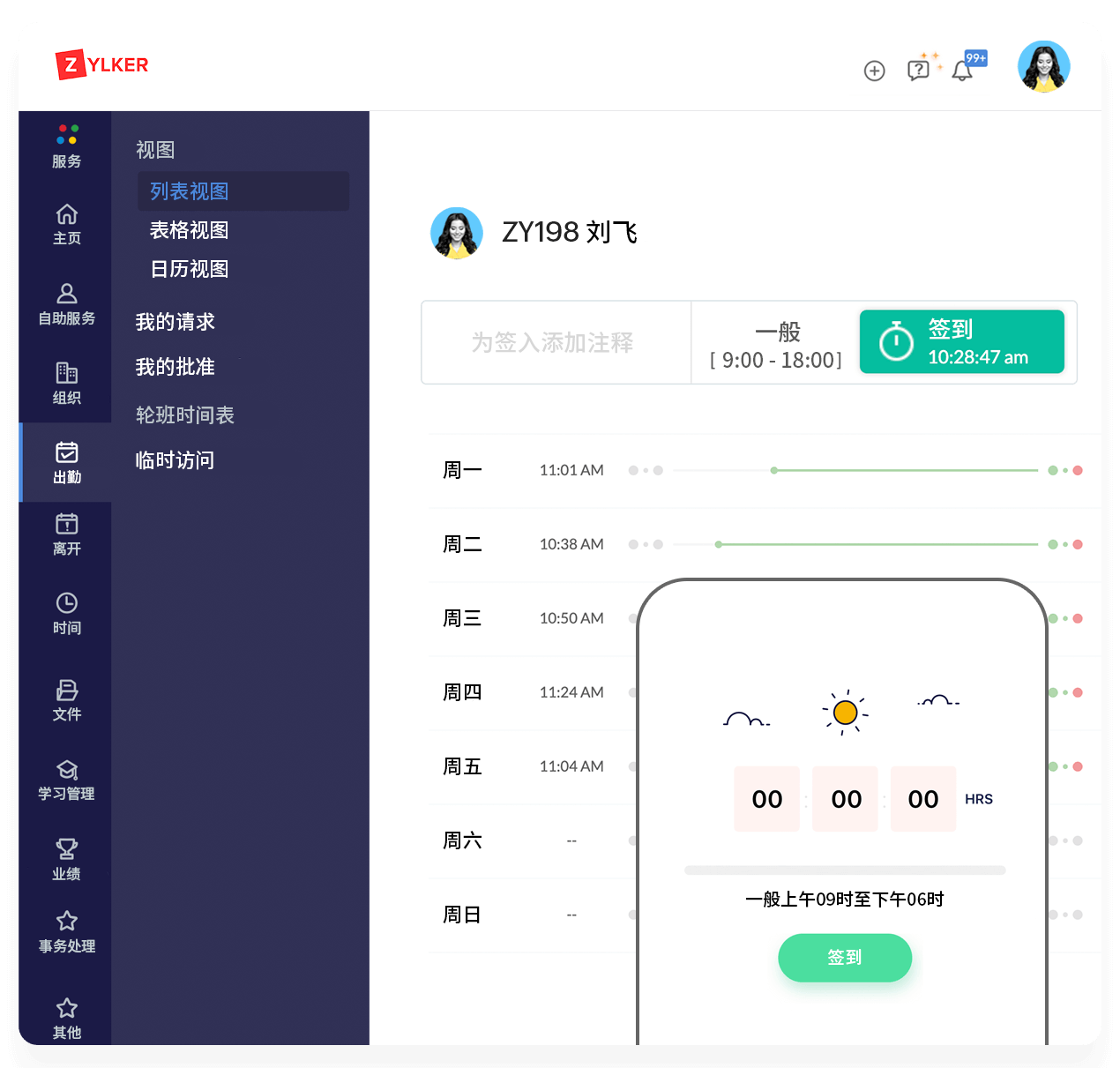 Zoho People 的考勤管理模块具有四种不同的考勤视图,可让员工清楚地了解他们的签到和签退时间、加班、缺勤情况等。视图一目了然,方便员工和经理获取相关的数据。