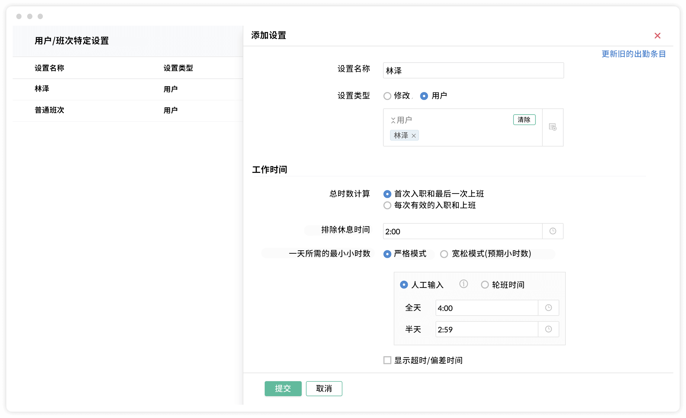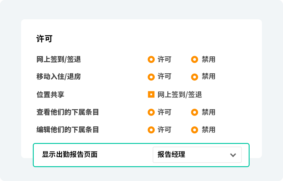 权限管理选项使管理员能够查看考勤报告、剩余时间,并允许或限制某些功能,例如 Web 签到。管理员还可以根据选择的评估模式,选择如何根据签到和签出的数量计算总工时。