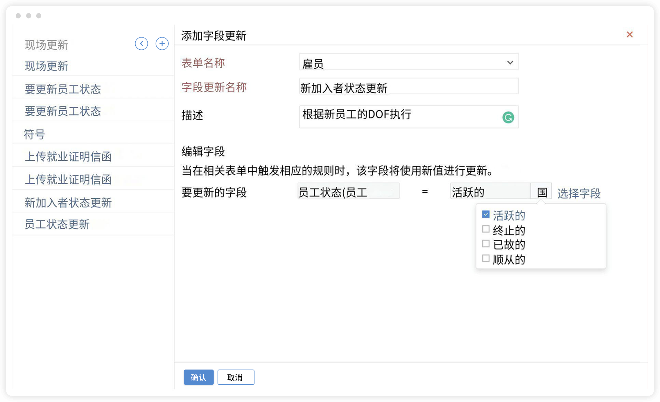 如果有新员工加入公司、另有一名员工升职以及一名员工退休,您需要更新很多数据字段来反映这些变更。在工作流中标记这些字段,Zoho People 会自动触发更新。
