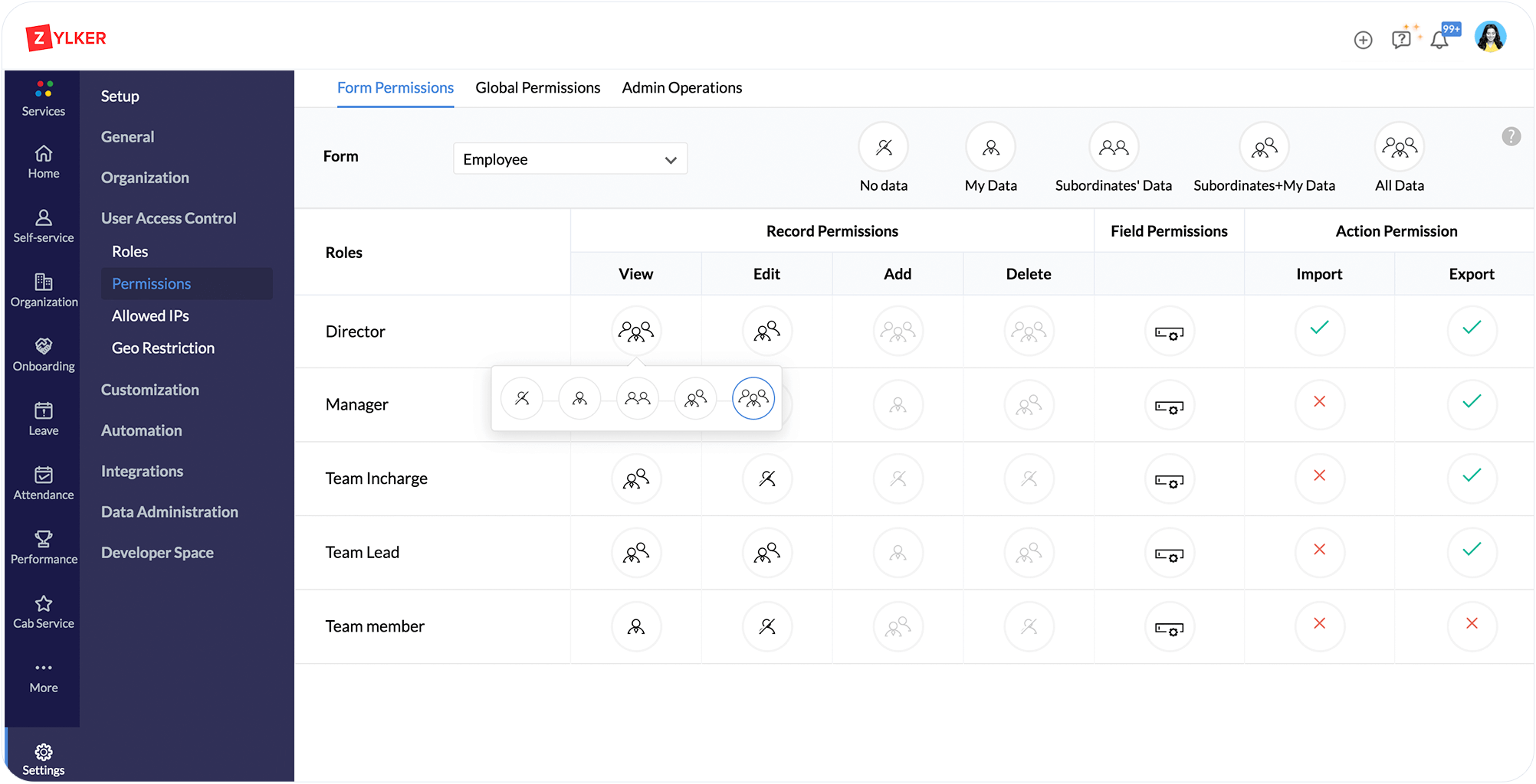 通过角色和权限以及字段级访问管理,可以确保数据的安全性。Zoho People 还提供对 GDPR 和 HIPAA 等全球法规的合规性支持。
