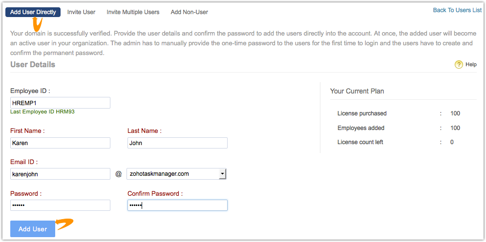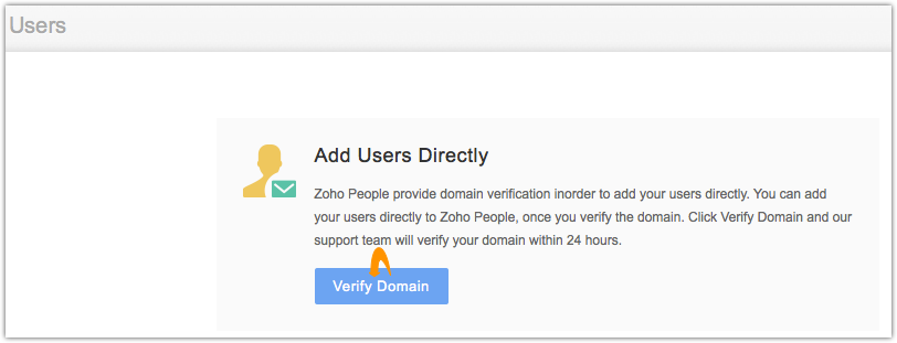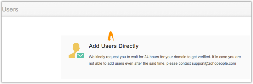 - 您需要等待几小时以让您的域得到验证.如果在上述时间之后仍不能添加用户,请联系 support@zohopeople.com。