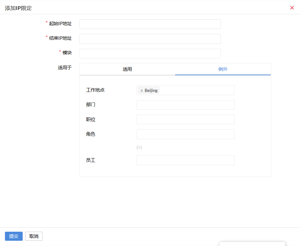 - 在“例外”下,您可以根据需要选择要排除的位置,名称或员工。根据上述示例,IP限制将适用于除北京以外的所有团队成员HR。