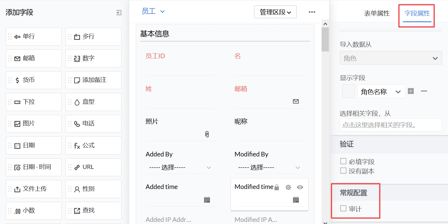 - 在'字段属性' > 常规配置下,启用'审计历史'