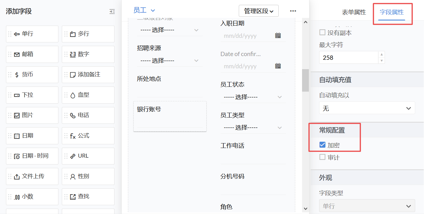 - 加密只能对'单行'、'多行' 和'数字字段'。