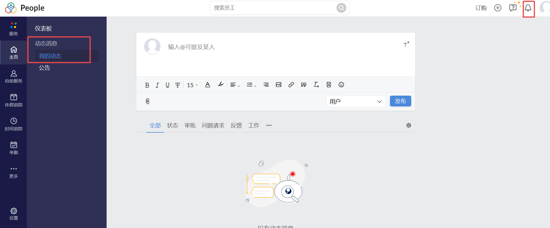 动态使您的员工可以将消息发布到特定成员,部门和组。动态可用于与团队进行有意义的正式讨论或公告。使用动态,可以将生日和告别消息标记为@提及,从而将其发布到特定用户。