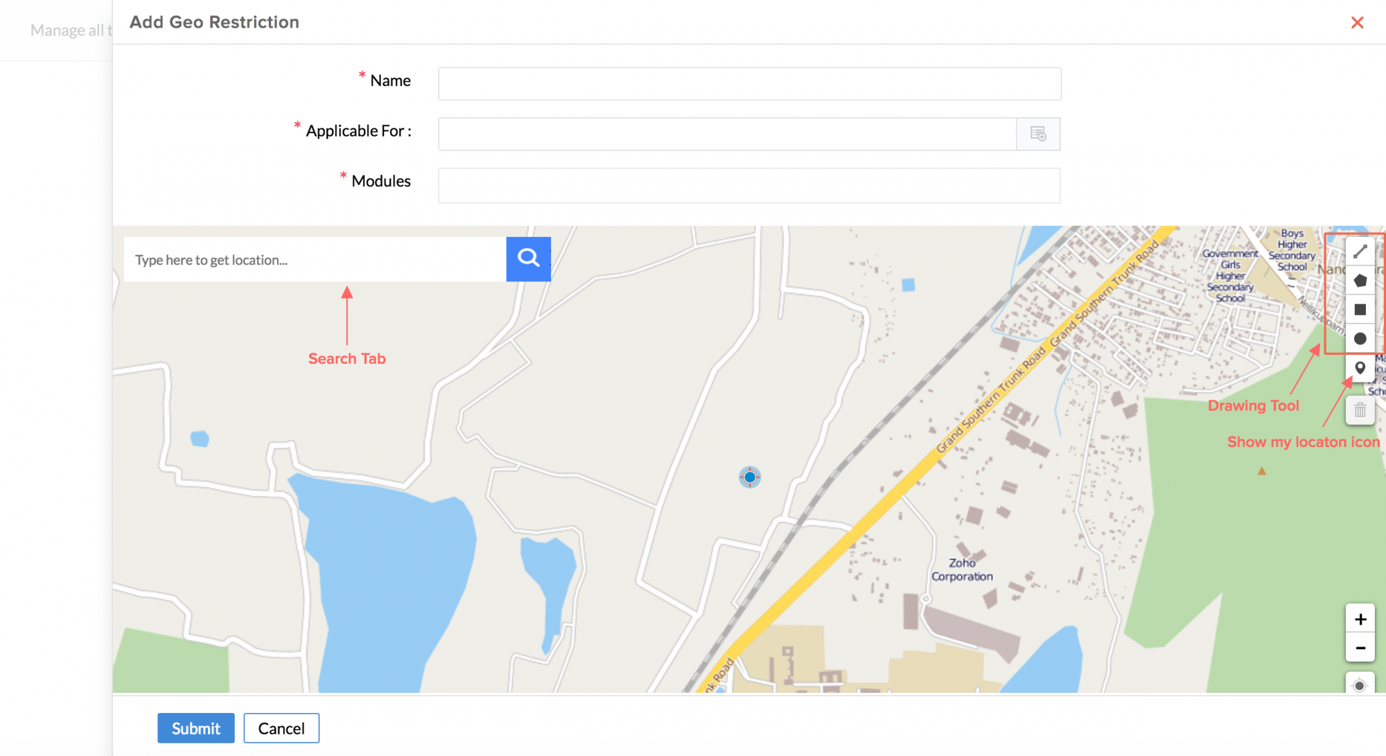 - 使用右手侧的绘图工具 (从各种形状中选择,如圆形,矩形,多边形等) 栏来选择地点范围