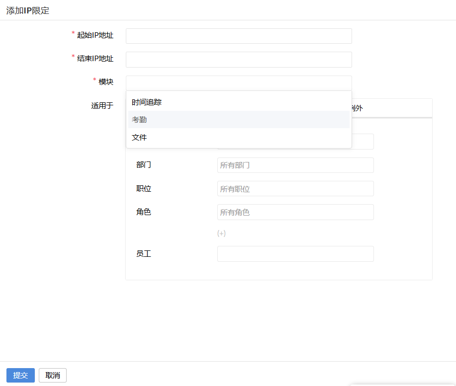 使用 IP 限定,您只可以定义员工能够从其访问模块的特定IP地址。然而,使用地理位置限定,您可以定义一个自其内能够访问模块的范围(位置) 。