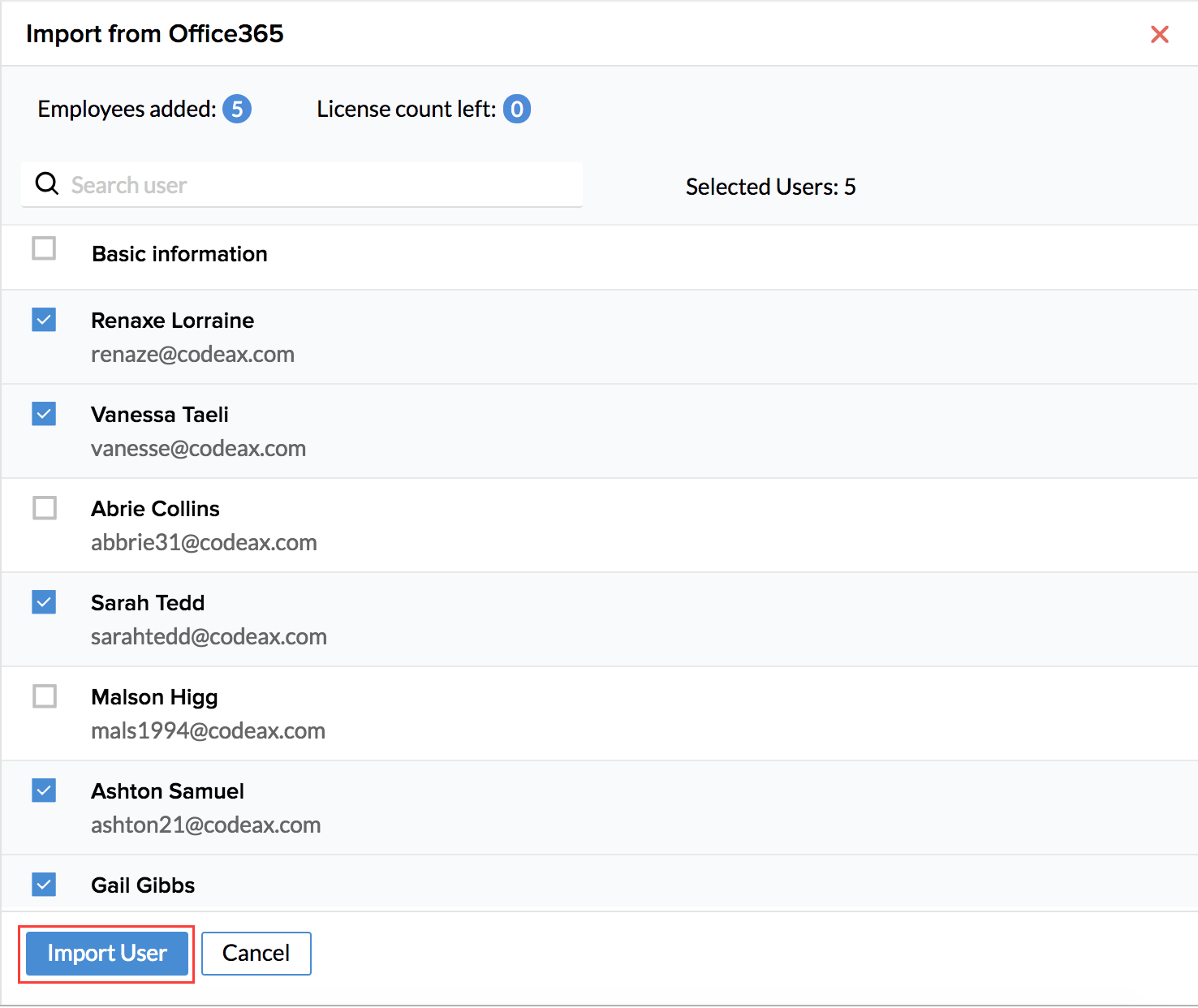 - 您将会自Office 365内看到列出的用户。从列表内选择用户以添加到您的Zoho People账户,然后点击'导入用户'